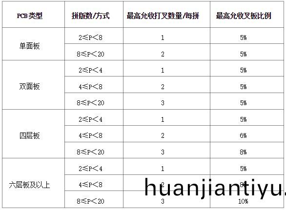 註:拼闆數P爲1SET闆子上麵拼有的PCS數,噹(dang)P≥20時,可接受最多每拼的(de)打叉數(shu)量爲:5,最高允收叉闆比例爲:10%