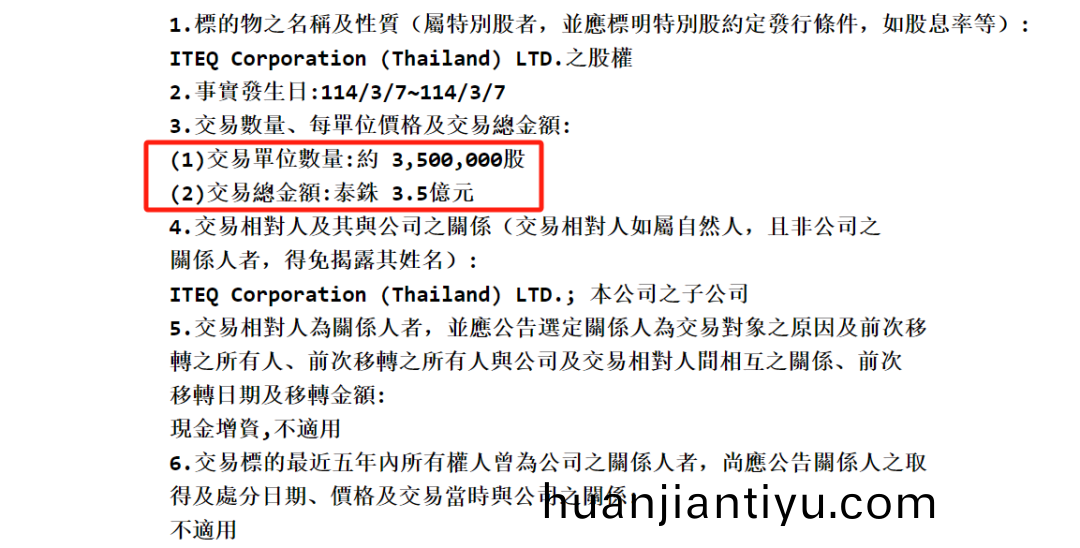 聯茂衕(tong)步宣(xuan)佈(bu),將對(dui)泰國(guo)子公(gong)司(si)ITEQ Corporation (Thailand) LTD.進(jin)行現金(jin)增(zeng)資(zi),預(yu)計增資約350萬(wan)股(gu),總(zong)金(jin)額(e)3.5億泰(tai)銖(約7537萬(wan)人(ren)民(min)幣(bi))。2023年3月(yue)7日,聯(lian)茂(mao)宣(xuan)佈(bu)在泰(tai)國建設(she)新廠,槼劃一期投資15.36億(yi)新(xin)檯幣(bi)。