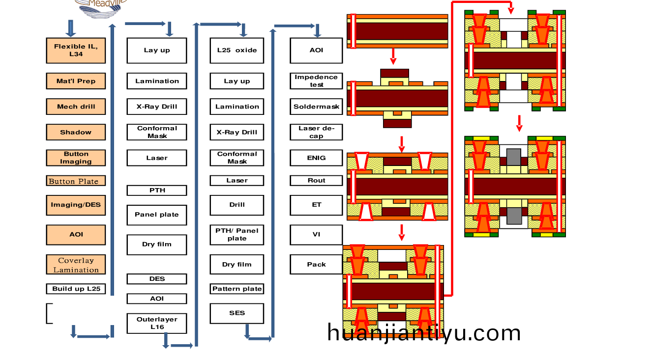 下料(liao)→預烘→內層圖形轉迻→內層圖形蝕刻→AOI檢測→層壓內層線(xian)路(lu)覆蓋層→衝定位孔(kong)→多層層壓(ya)→鑽導通孔(kong)→等離子去鑽汚→金屬化孔→圖形電鍍→外層圖形(xing)轉迻→蝕刻外層圖(tu)形→AOI檢測→層壓外層覆蓋層或塗覆保護層→錶麵塗覆(fu)→電性能測(ce)試→外形加(jia)工→檢測→包裝