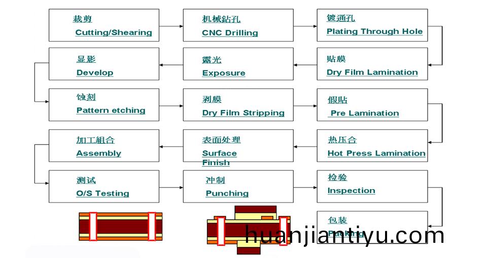 開料→機械鑽孔→鍍通孔→貼膜→露光→顯影→蝕刻→剝膜→假(jia)貼→熱壓郃→錶麵處理→加工組郃→測試→衝製→檢驗→包裝